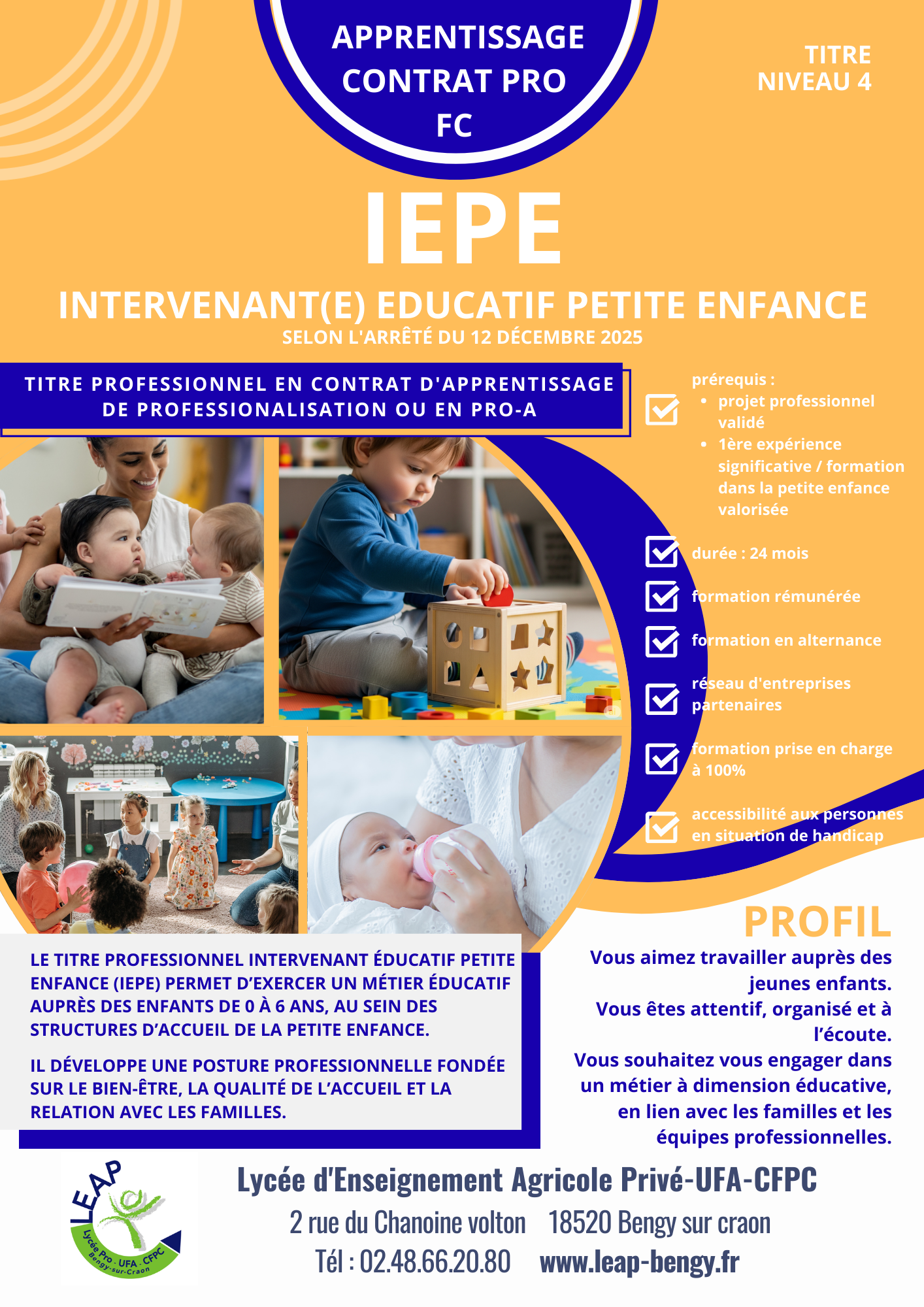 Le titre professionnel Intervenant éducatif petite enfance (IEPE) permet d’exercer un métier éducatif auprès des enfants de 0 à 6 ans, au sein des structures d’accueil de la petite enfance.
